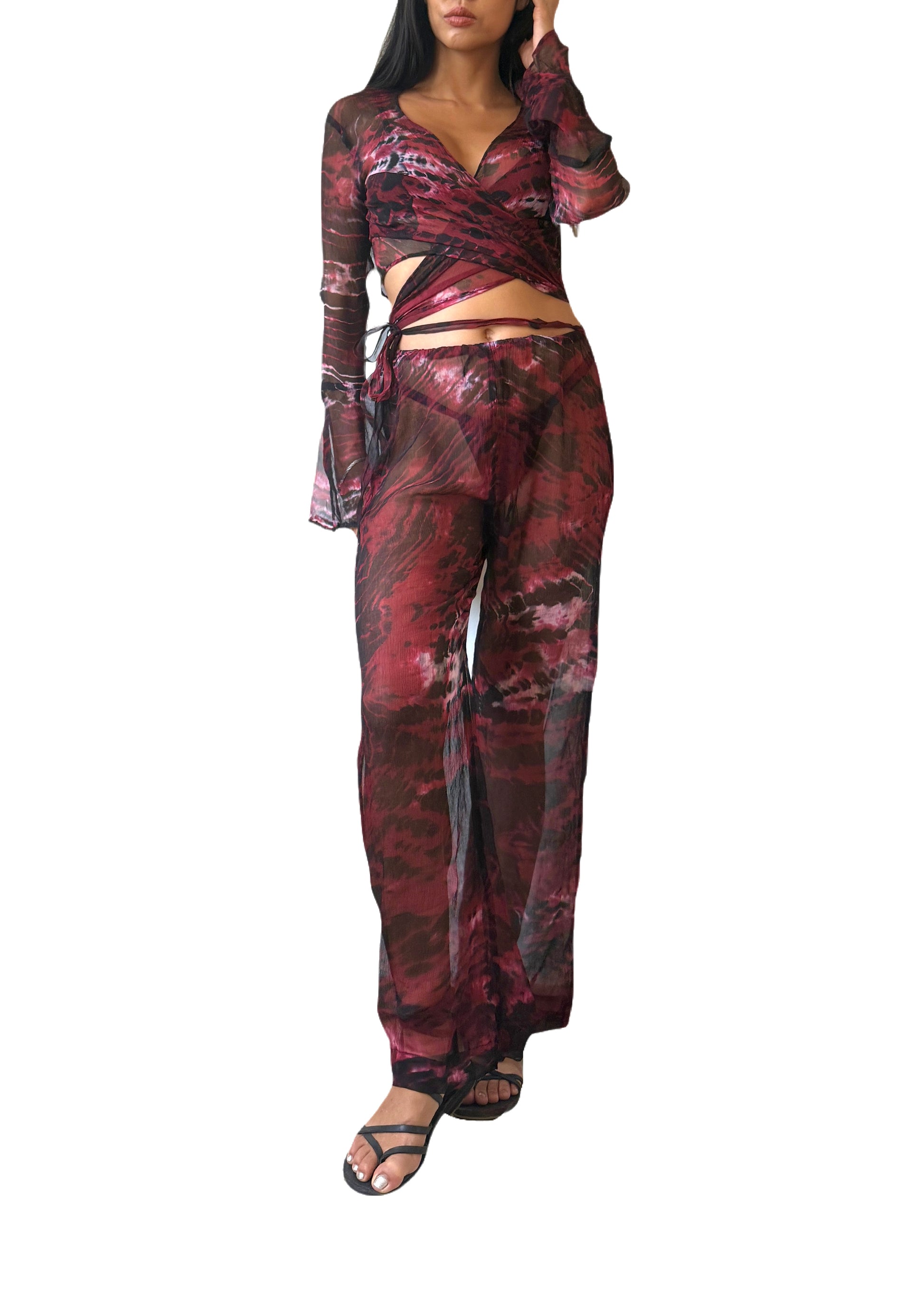 Hand dyed semi-transparent silk chiffon. Long sleeves flare at the cuff, with a long tie to wrap around the body in different ways, a spike bead at the end of the ties. The top can be worn reversed for a different look. The textured crinkle silk has a bit of stretch to the fabric. Pants close with elastic waistband with tie.