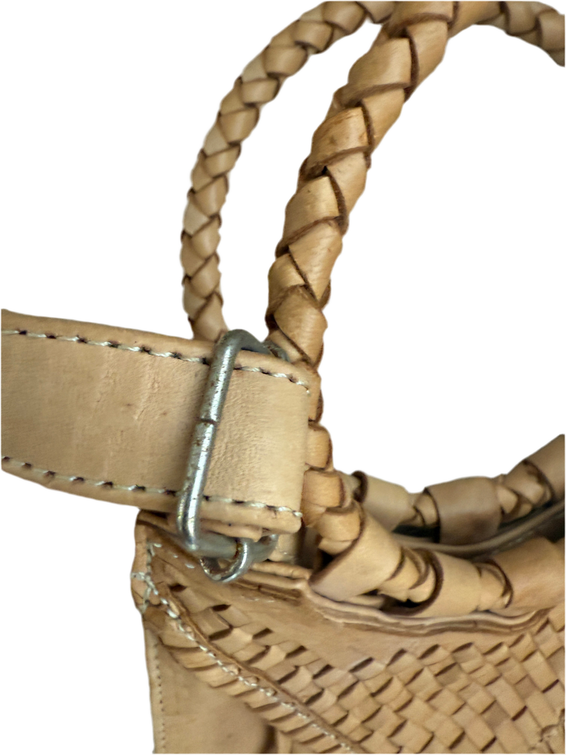 This versatile purse is made of soft genuine leather with intricate hand weaving and fringe on the front. Newer version with long fringe swinging below. The crossbody strap is detachable so that it can be held by the hand braided circular metal handle. Magnetic closure and inside pocket.