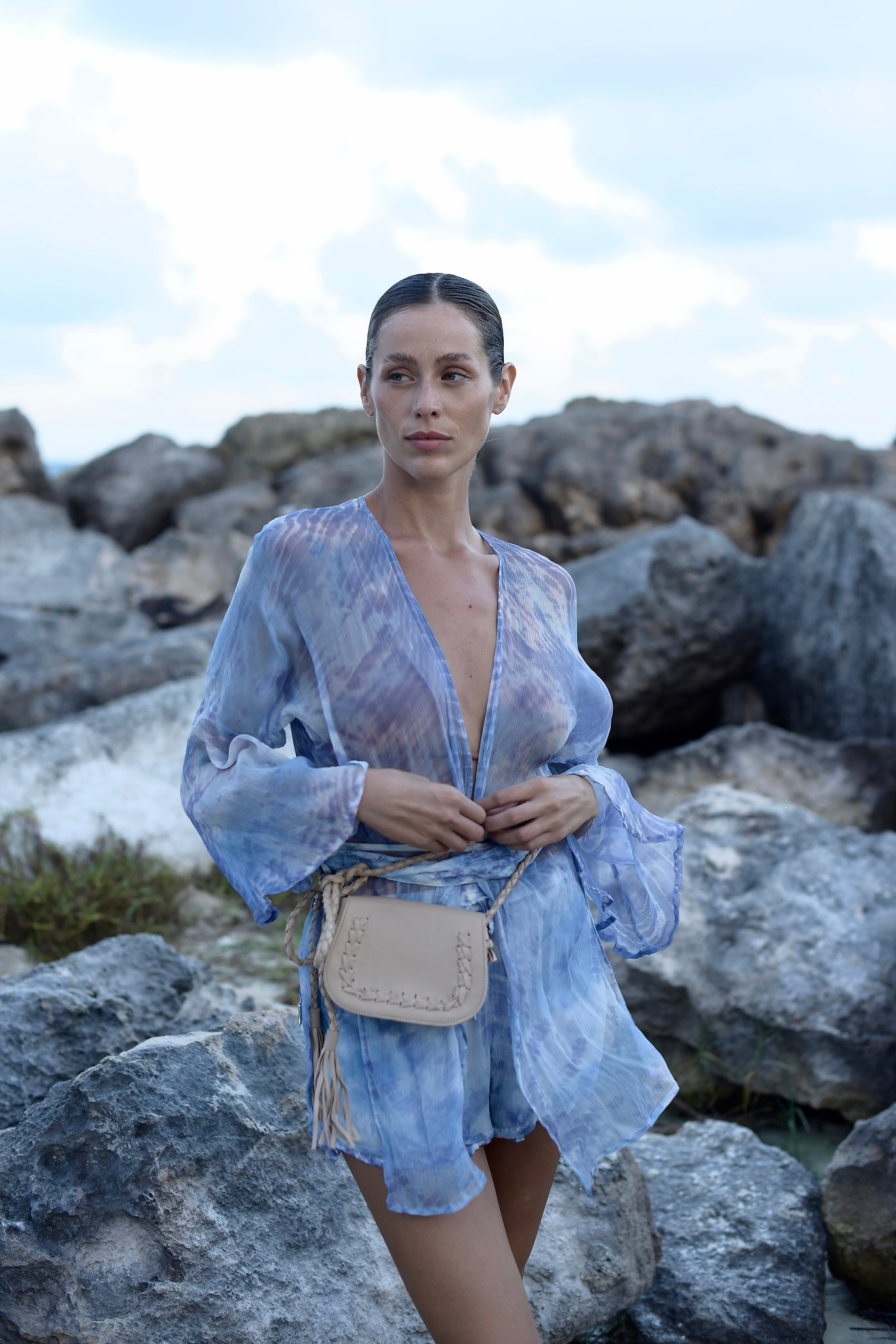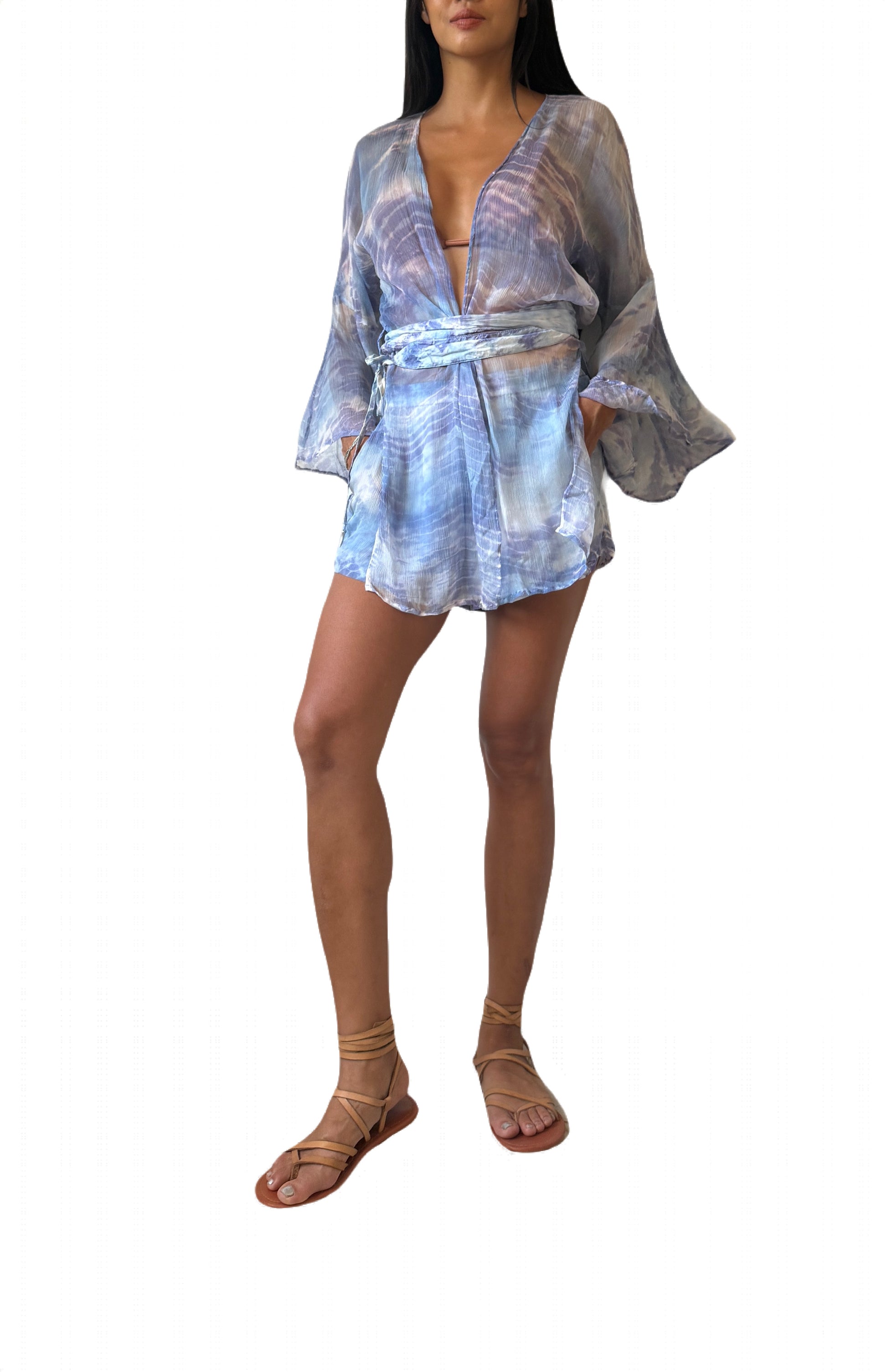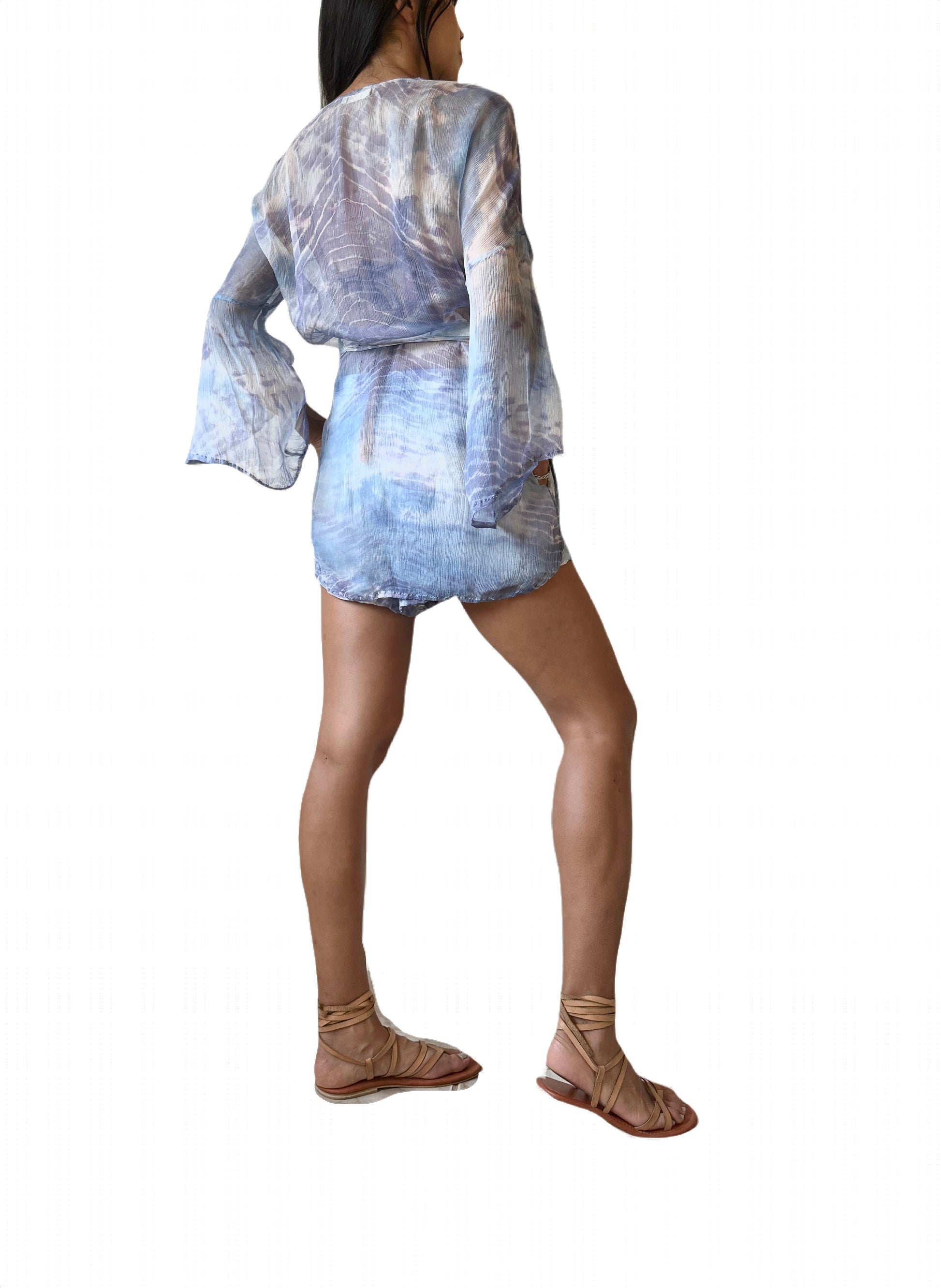 Hand dyed semi transparent silk chiffon set with kimono and shorts. Flared sleeve kimono can be tied with the dyed satin waist belt, adorned with metal spike beads at the ends of the ties. Shorts are fully lined with pockets and elastic waistband.